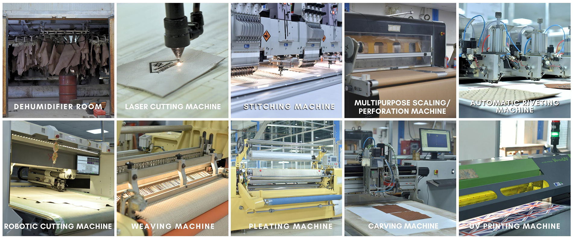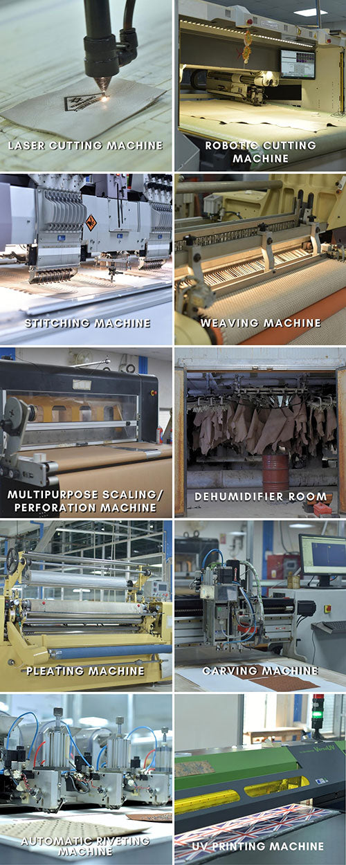 Ex- Robotic cutting machines, Multipurpose scaling/cutting/perforation machines laser cutting machines, weaving and pleating machines, dehumidifier rooms, automatic riveting machines ,Digital & UV printing machines.